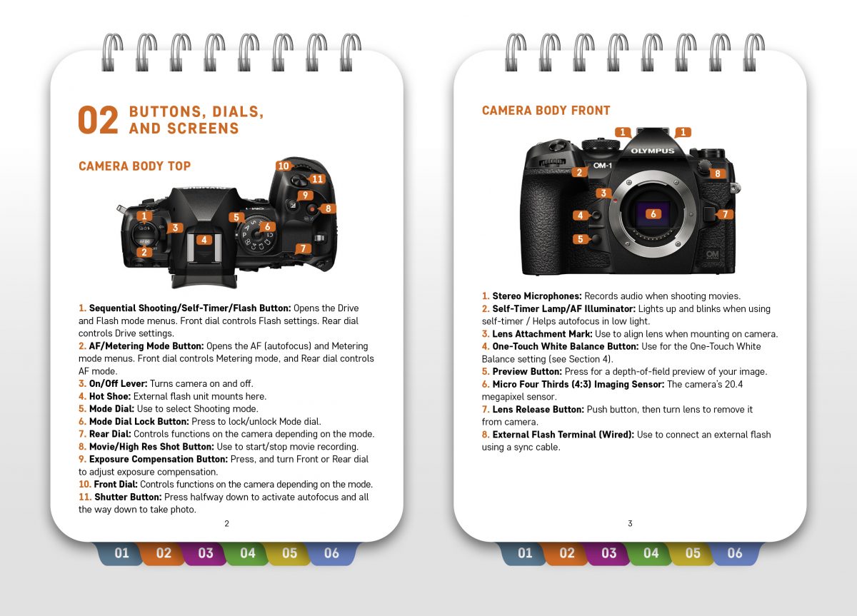 I appreciate the fact that this guide is a fairly short, compact guide to help you begin to learn to shoot with your new OM-1 Olympus camera. It’s also just the right size to take with you when you travel. Perfect! And speaking of a guide useful in the field, the first page of content is a pre-shoot checklist, which displays your own preferred settings for various tools including drive mode, image stabilization, picture mode, exposure, compensation, etc.