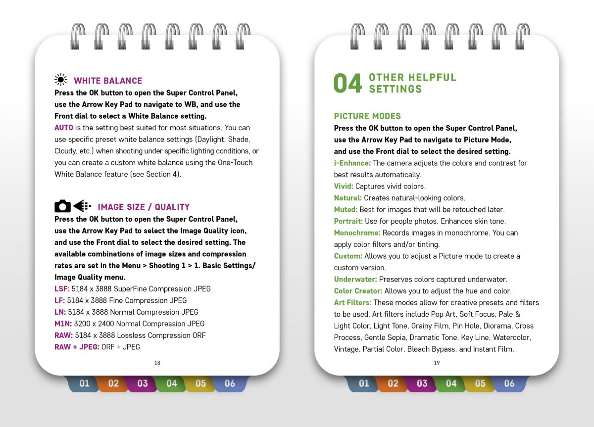 I should mention that the various sections outlined in the table of contents are physically tabbed for very easy reference. Although Olympus‘s instruction manual likely gives much of this information, this pocket guide is better, more accessible, when you are shooting. The book covers the essentials with enough detail to tell you which setting you likely want. Much more useful than the average overstuffed instruction manual.