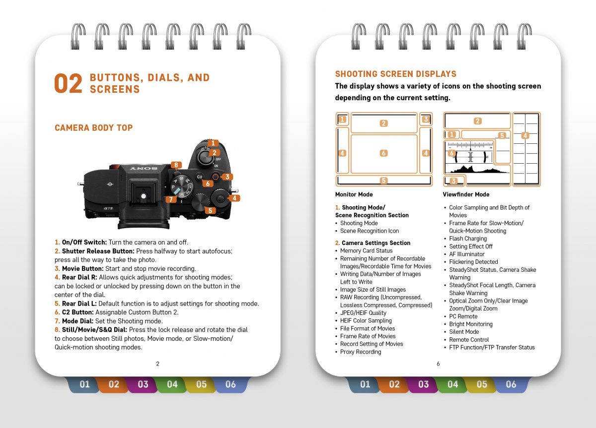 The guide begins with labeled images on the camera from all angles, identifying the physical controls found on the body and then identifies the data that can be viewed on the displays in various modes. The latter is quite helpful since some data is quite cryptic to the novice Sony shooter.