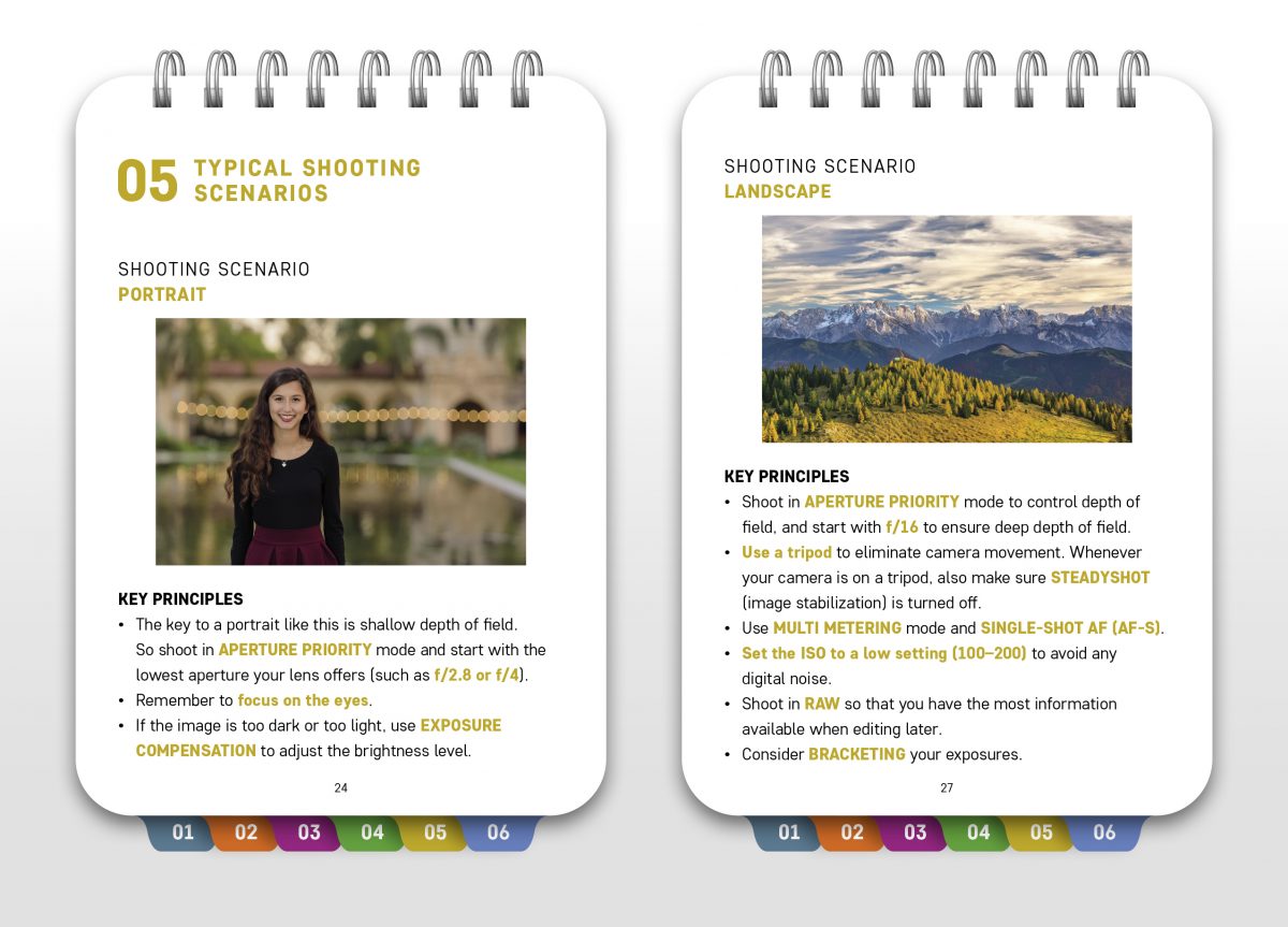 - • Follow tips and techniques for getting great shots in typical scenarios (portrait, landscape, freezing action, low light, etc.)